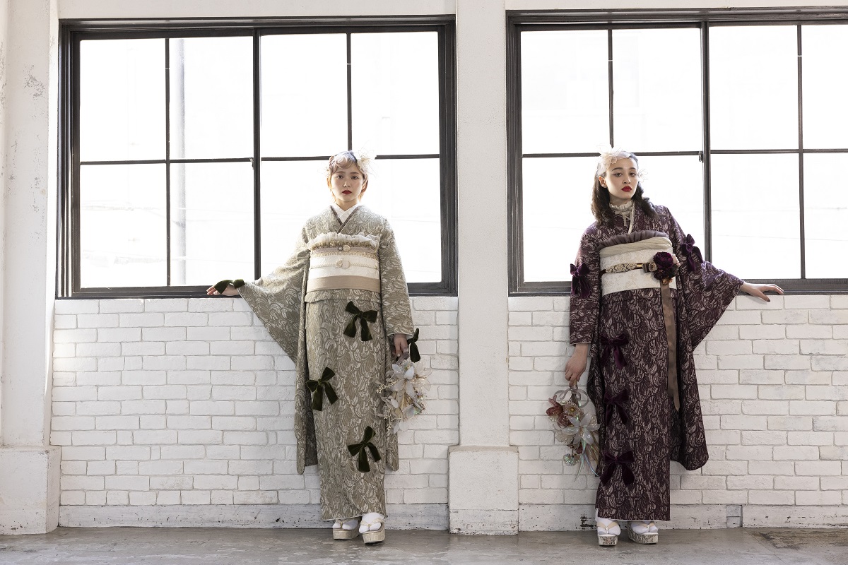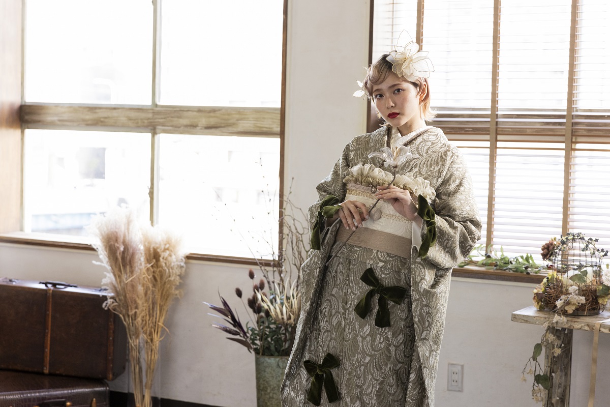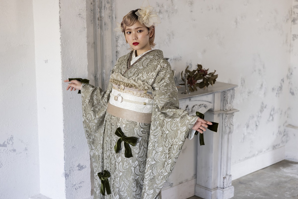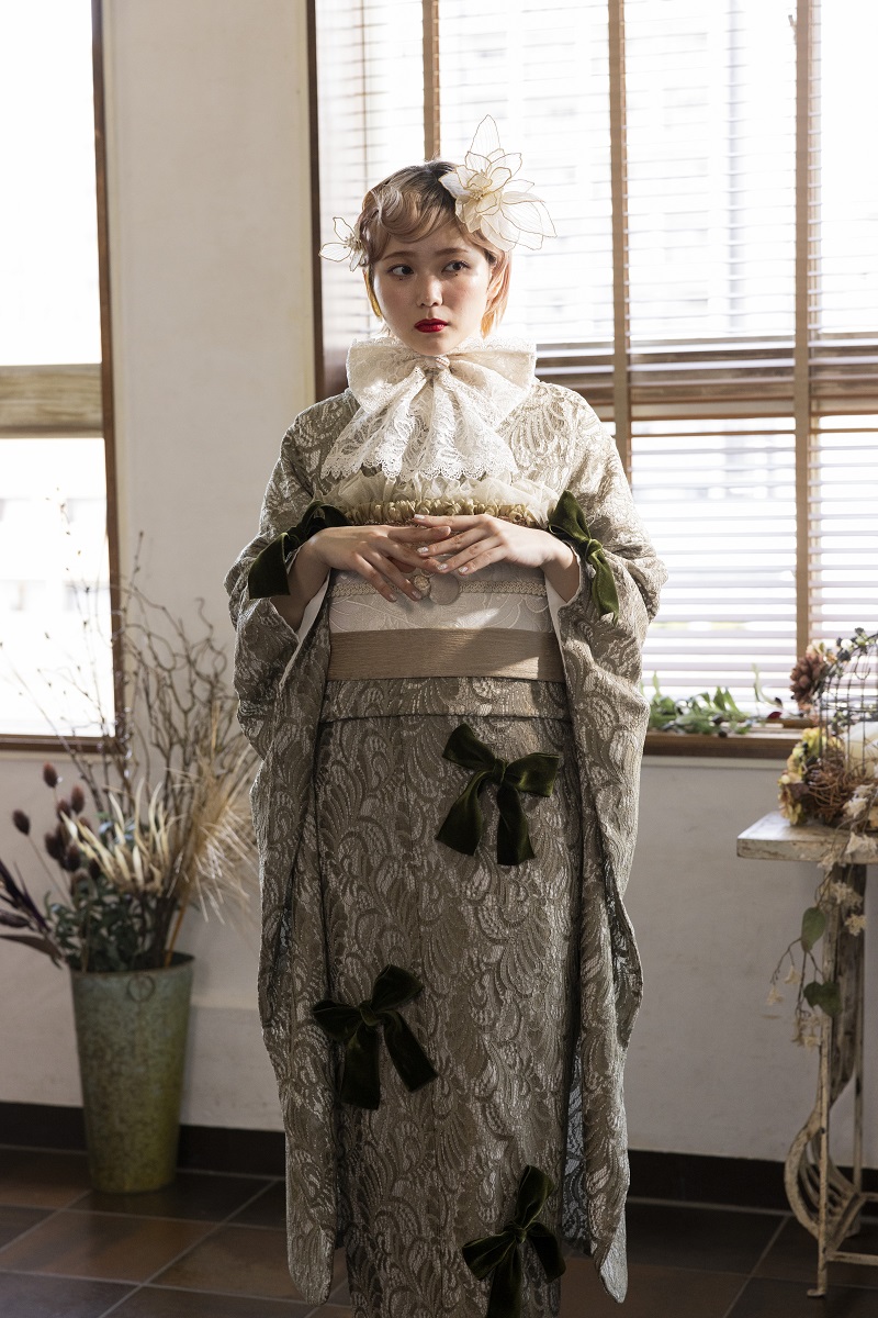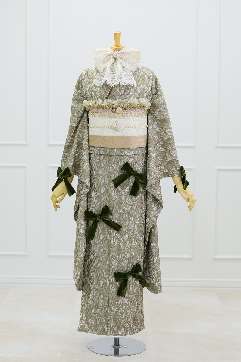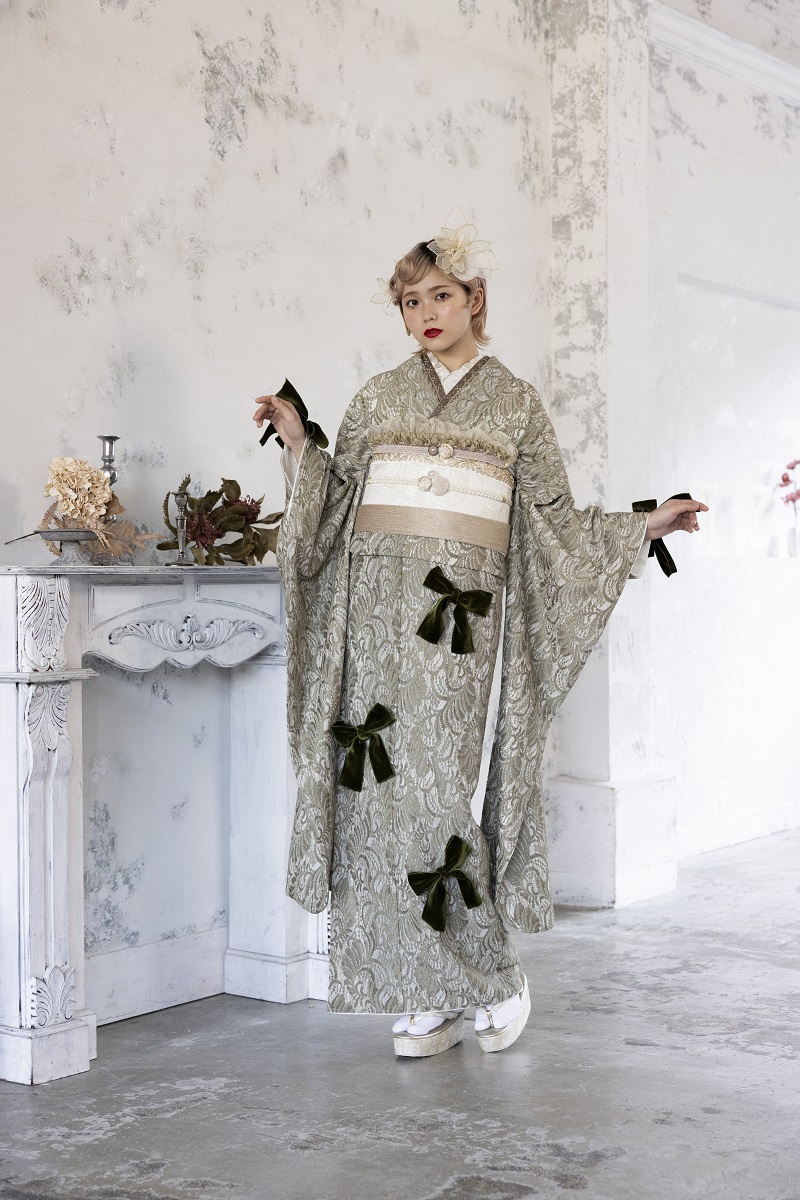 合繊振袖ラフィネモカ GF-63 -レース&リボン-【グリーン】